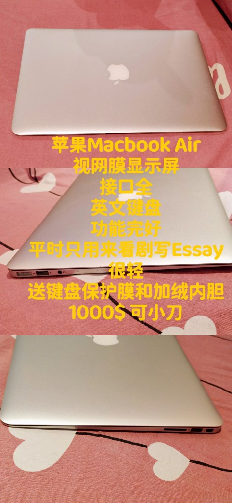 接口全,功能完好,轻薄易用。平时只用来看剧和写essay,送键盘⌨️保护膜,$1000🉑️小刀。微信联系:Weixiaoliang0_0