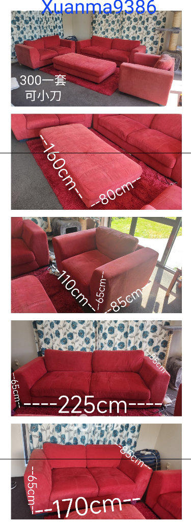 沙发尺寸如下图,一直保持的很好而且定期清洁。 300d 可小刀。Wairakei 自取,微信 xuanma9386。电话:+64204930430。邮箱:garyyjs430@gmail.com
