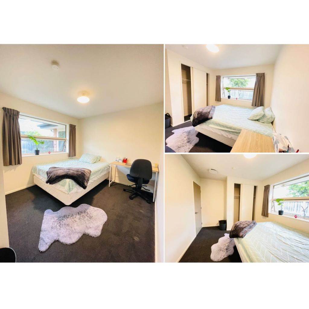 1️⃣包电和网(高网速光纤上网950/500)2️⃣房间带有嵌入式衣橱、双人床、桌椅、风扇3️⃣只和一位友好开朗的女生室友share一个浴室➕一个分开的卫生间,此卫浴有定期清洁维护4️⃣全屋双层玻璃和HRV通风系统5️⃣近坎大/ Riccarton mall / Upper Riccarton亚超圈: 车程8-10分钟,林肯大学: 车程15分钟,极近Wigram New World/三商亚超,所在社区十分安静整洁6️⃣全屋总共只住4人,现3位室友均为认真工作/热爱生活/积极进取的青年,作息朝八晚五、友好沟通、成熟安静、欢乐但不吵闹无party,偶尔会来场火锅/烤肉,周末喜欢打羽毛球7️⃣欢迎年纪相仿、无烟宠、作息规律的上班族/学生党加入我们!8️⃣欢迎咨询/预约看房。手机: 0221948455,微信号: chchsf168